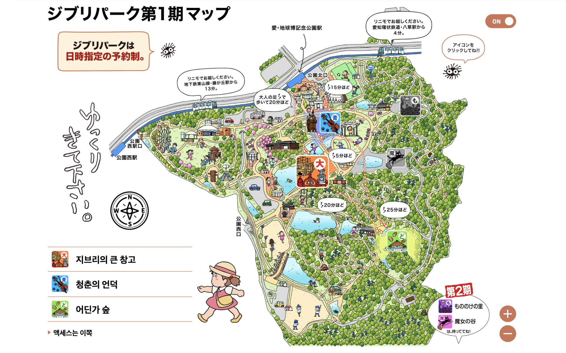 저는 오픈하는 11월 달에 맞추어 10월 지정일에 예매하였고, 다행히도 청춘의 언덕, 지브리 대창고, 돈도코 숲 모두 예매 완료할 수 있었습니다. 아직 1기 오픈으로 3군데밖에 개장하지 않았지만, 모든 섹션의 입장시간은 오전 9시부터 오후 4시이므로 개인적으로 하루 만에 세 군데를 모두 둘러보기에는 시간이 빠듯했습니다.